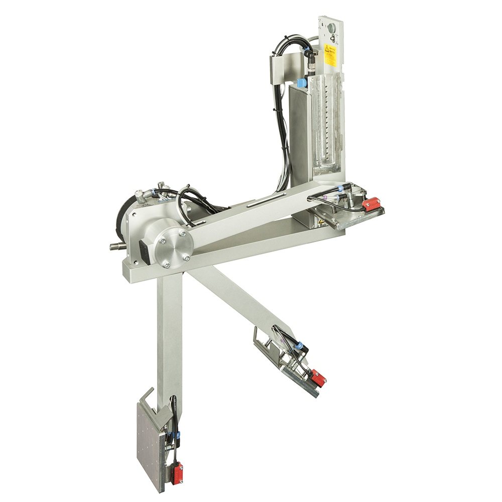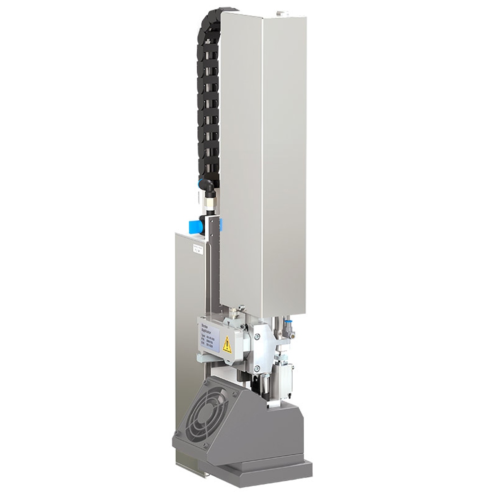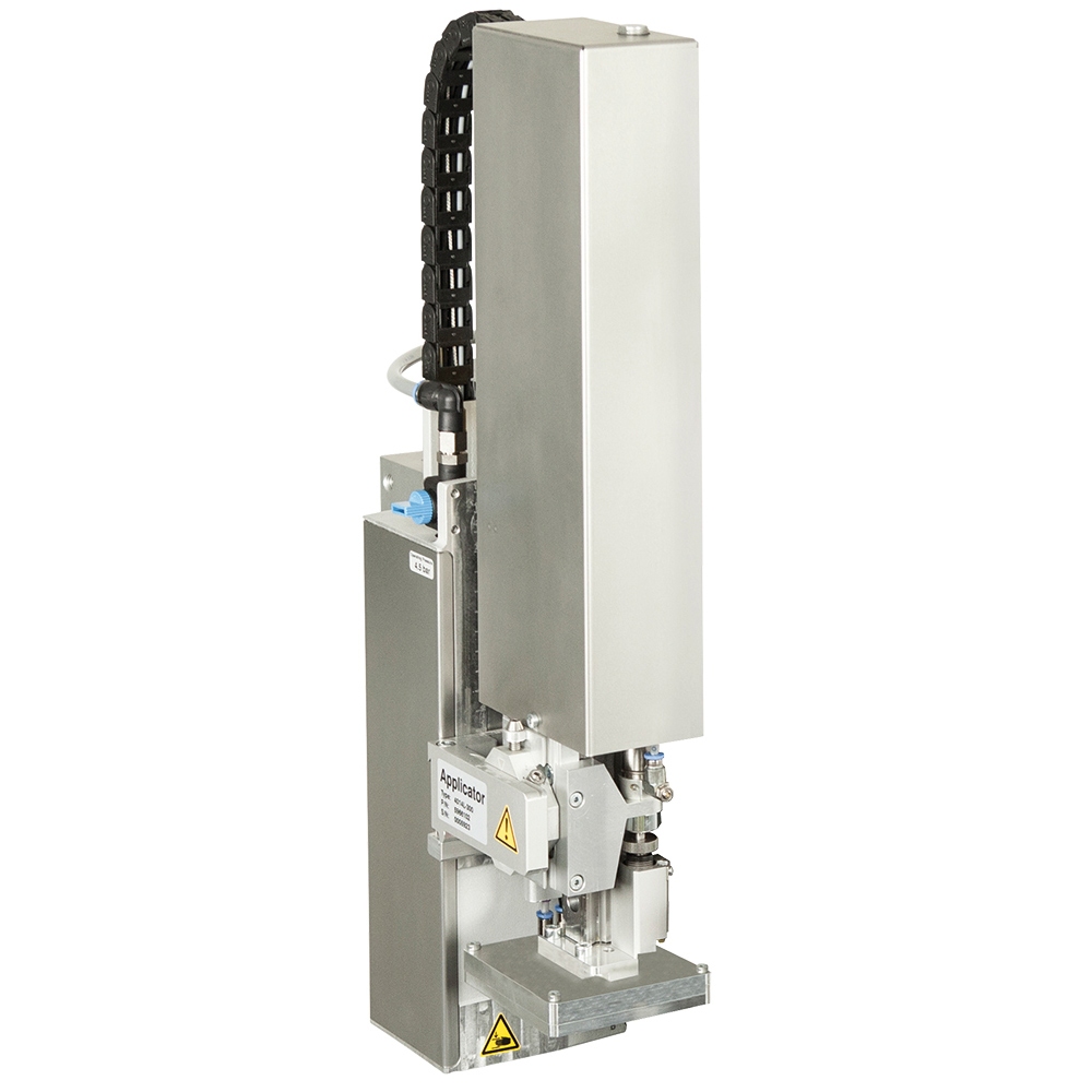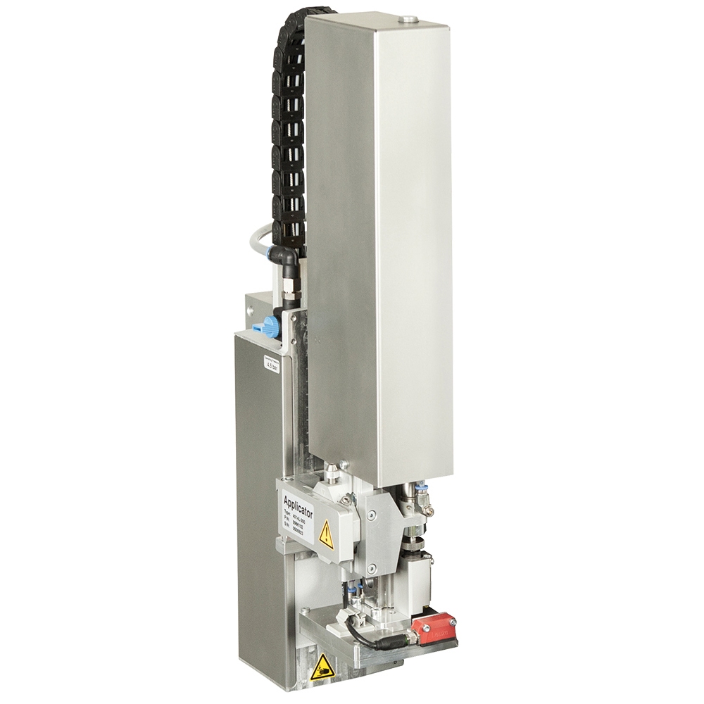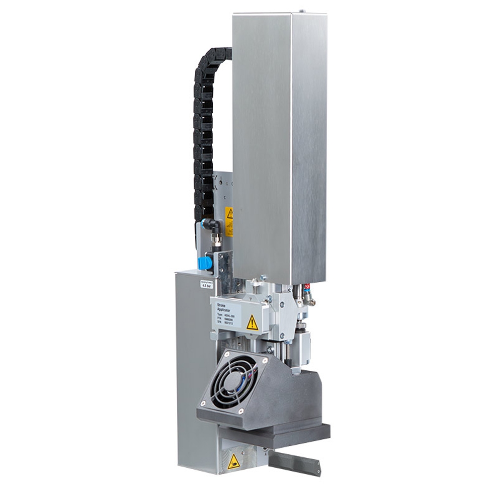 Schnelles Etikettieren im Durchlauf oder Stillstand. Die Etiketten werden von einem Lüfter angesaugt und von einem kräftigen Luftstoß durch ausgerichtete Düsen abgeblasen.